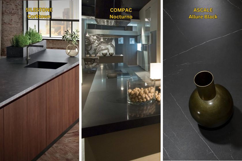 Alternativas: el Compac Nocturno (centro) esta fabricado con bajo silice, negro profundo uniforme en cuarzo, resistente a manchas y con brillo controlado, ideal para islas grandes o cocinas abiertas. Y el Ascale Allure Black (derecha) en porcelánico, negro veteado con toques marrones y grises finos, inspirado en piedras naturales, perfecto para minimalismo con carácter.