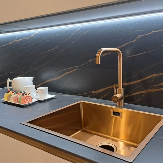 - Baños o vestidores: Ideal en lavabos o encimeras con grifería dorada o negra – crea un efecto spa oscuro, lujoso y envolvente desde el primer momento.