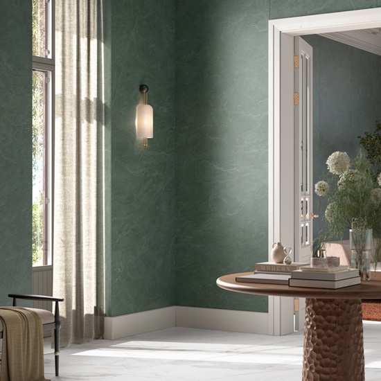 El porcelánico se integra en entornos reparadores, uniendo verde intenso con higiene extrema y resistencia térmica, potenciando bienestar en villas, bares, restaurantes y oficinas de Málaga.