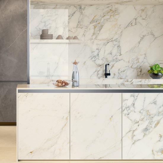 - Nuestros marmolistas cortan Laminam Arabescato Gold a medida por su paleta blanca con variaciones doradas que capturan la esencia de mármoles premium y texturas dinámicas.