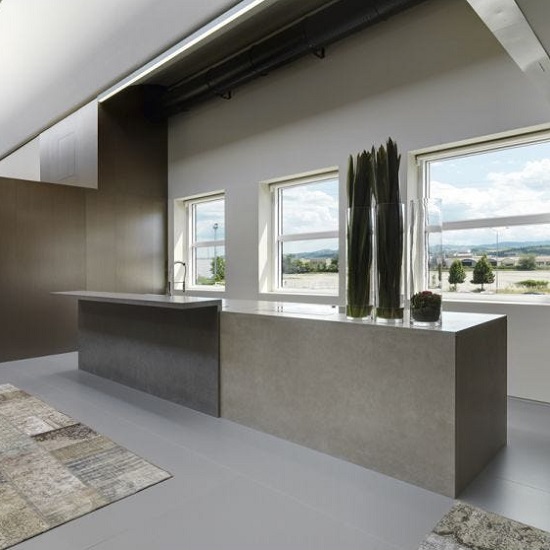 Laminam Fokos Piombo en hogares y espacios comerciales
