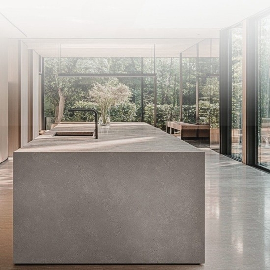 Este modelo de encimera Laminam Stone Grey destaca por su tono gris suave que potencia la luz natural en espacios contemporáneos.