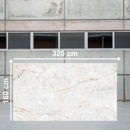 Encimera Venux Aurora Crystal: Superficie porcelánica con fondo blanco translúcido y venas doradas/grises. Imita mármol Aurora Crystal, resistente a manchas, rayones y calor, ideal para cocinas luminosas. Leer más