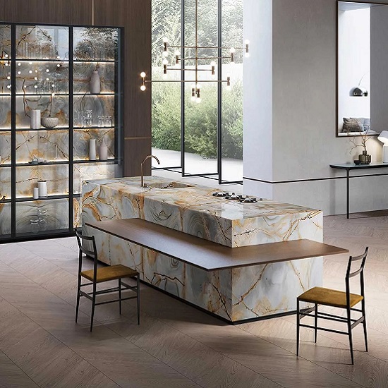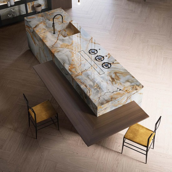 - Perfecta para estilos premium, combinando exotismo y robustez, con superficies que brillan bajo luz y se mantienen perfectas con cuidados mínimos en cocinas activas.