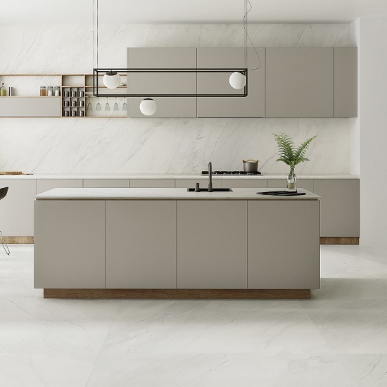 Crea un ambiente fresco y distinguido, con diseños continuos que se expanden por la losa, evocando materiales naturales con variaciones delicadas que maximizan luz y profundidad, ideal para entornos que buscan amplitud visual.