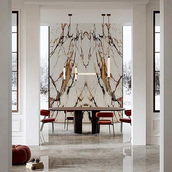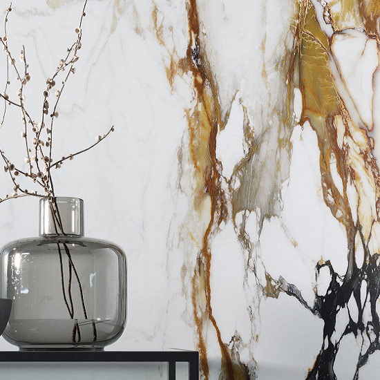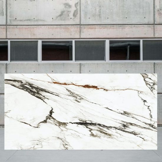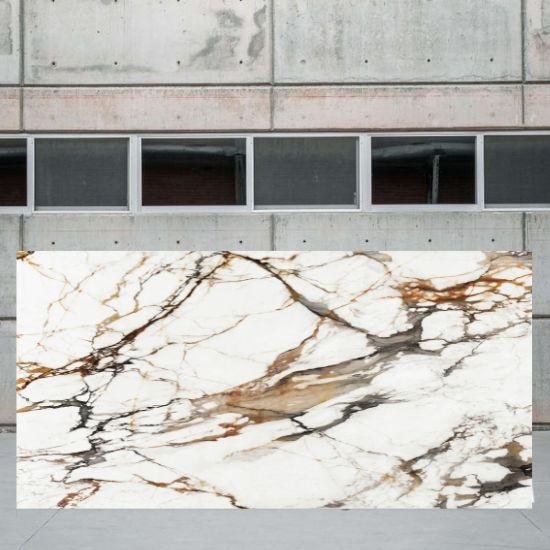 Crea un ambiente opulento y clásico gracias a su inspiracion en el marmol Calacatta Macchia Vecchia, con patrones continuos que se expanden por la losa, evocando mármoles exóticos con variaciones moderadas que aportan profundidad y un toque de lujo natural.